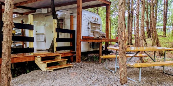 Skipper is a 24 ft, 1964 Avion Coach! Here you can enjoy grilling and hanging out after a day at the lake or just as a weekend getaway! Skipper is a rugged 60 yr old original aluminum riveted aircraft construction travel coach that we discovered on a Mercer County farm. After 60 years of fun times, a little TLC was required along with small updates to make it comfortable and cozy for your camping stay (see amenities below). Though still not perfect, it's full of charm and ready for new memories. We enjoyed bringing Skipper back to life as a part of Cedar Creek Camp. (Above picture was taken before deck and cabins were built!) To learn more about the interesting history of the Avion Coach, visit this page: http://www.silveravion.com/history.html